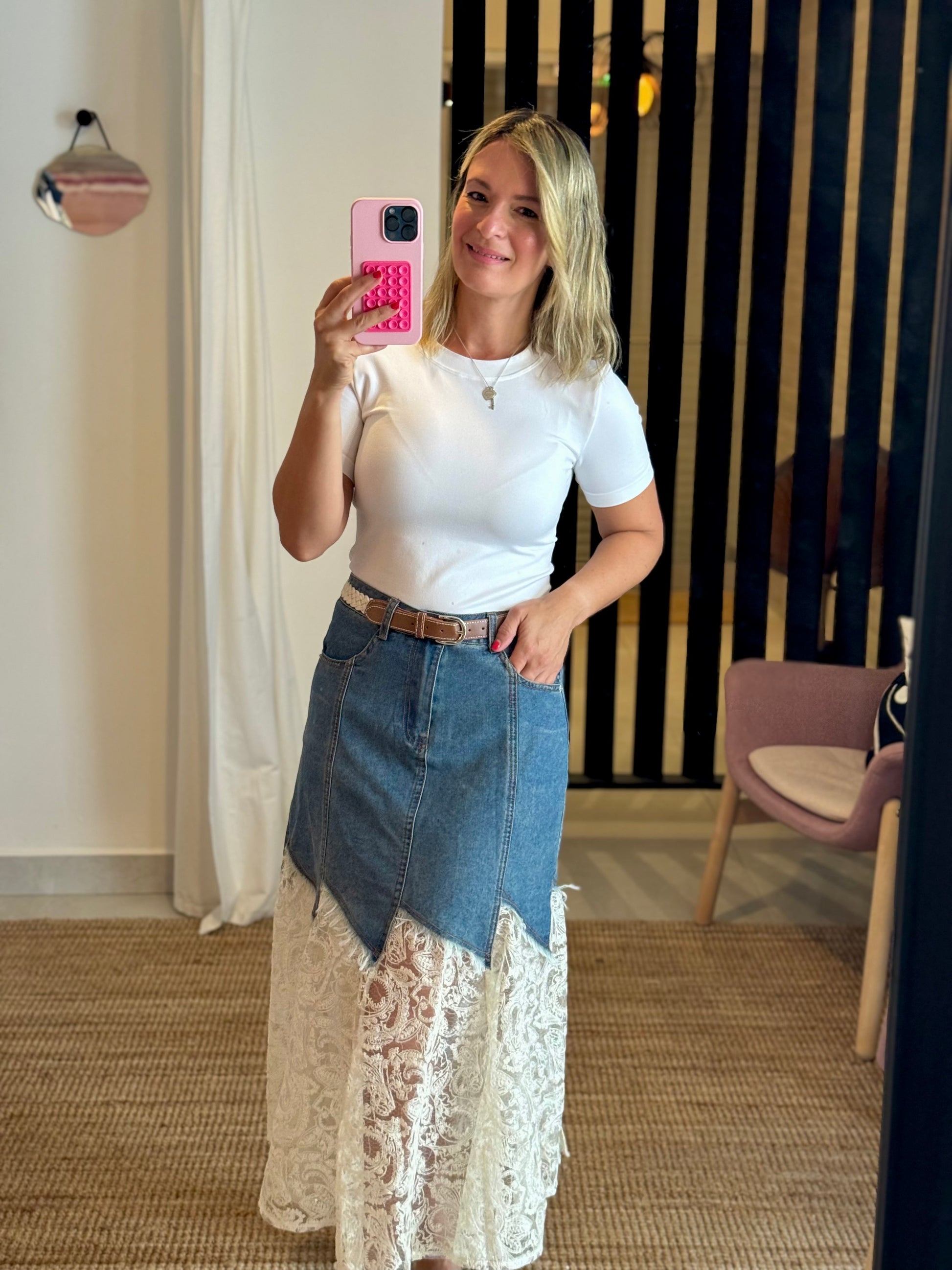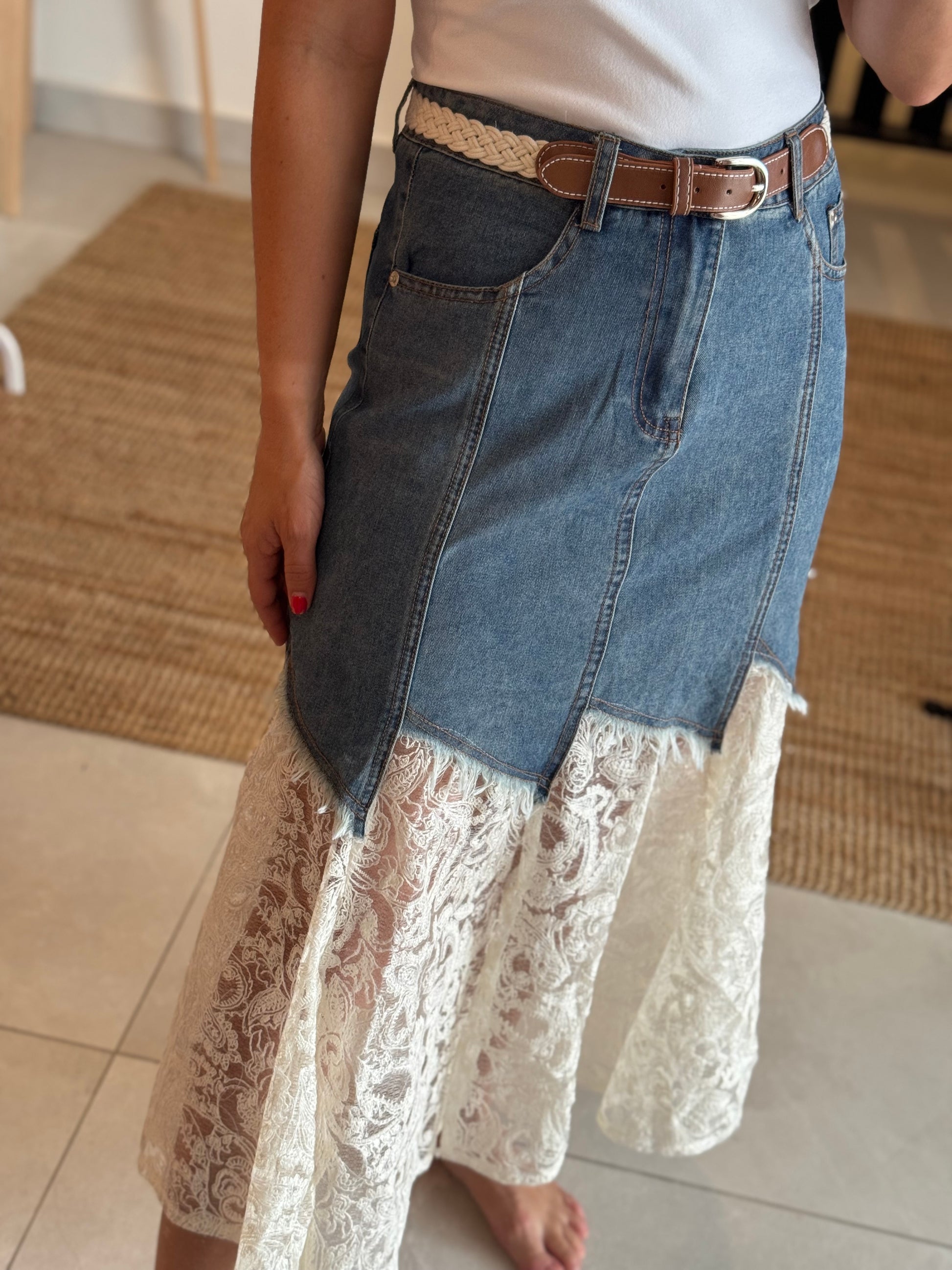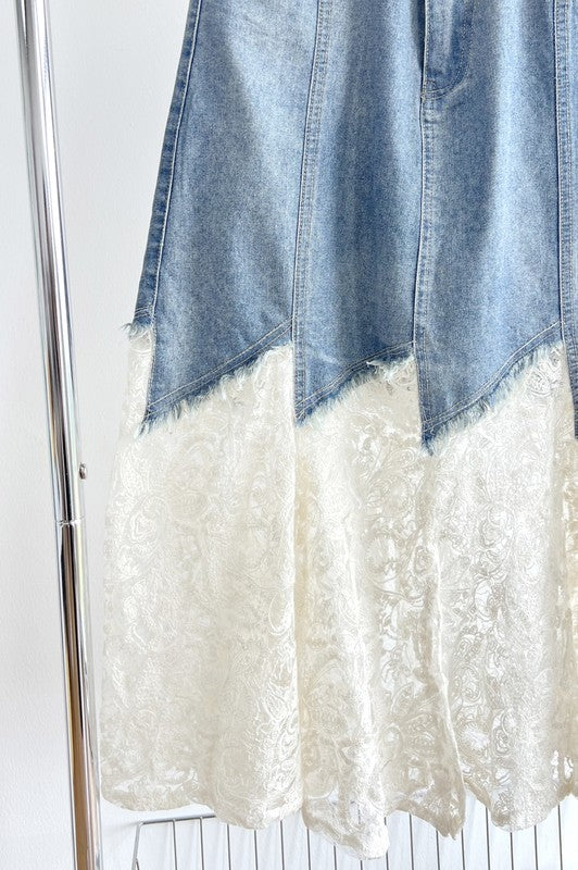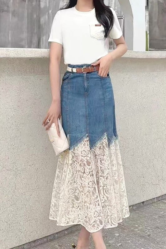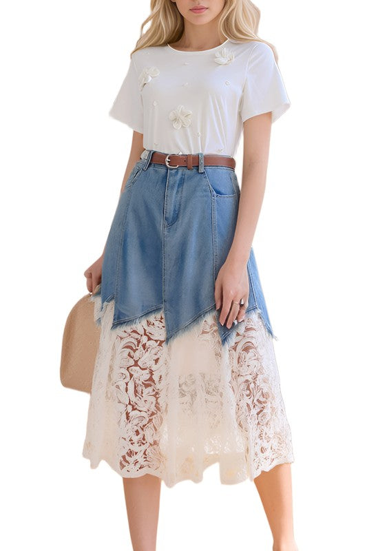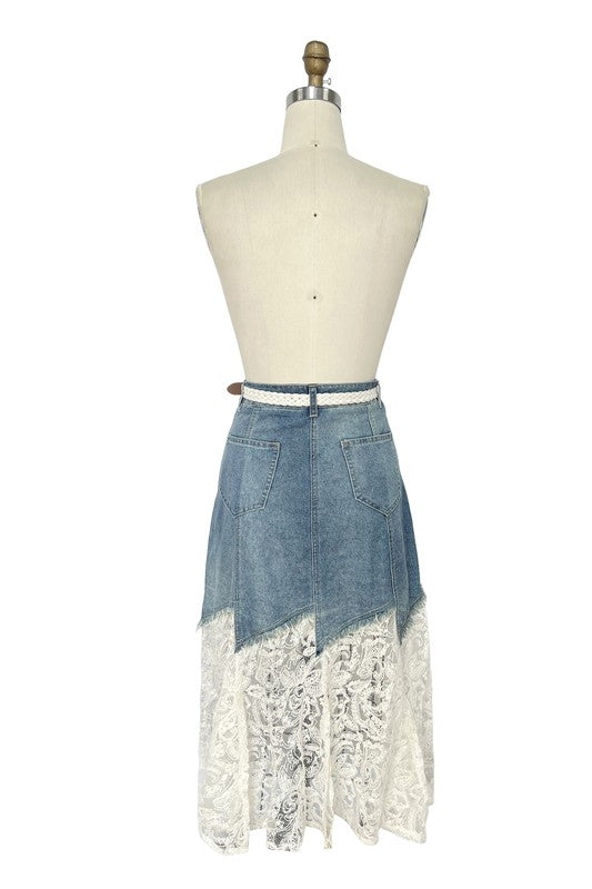 Belted Denim & Lace Midi Skirt